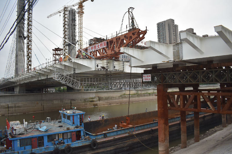 中江橋主橋合龍后,將按順序進(jìn)行后續(xù)MB10、MB11節(jié)段安裝,計(jì)劃十一月中江橋主橋鋼箱梁、預(yù)制橋面板全部安裝完成。