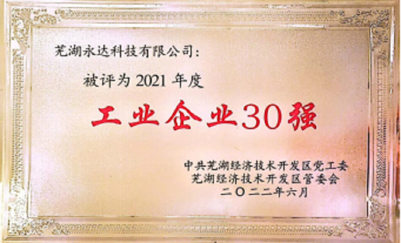 2022年6月9日下午,在蕪湖經(jīng)濟技術(shù)開發(fā)區(qū)管委會一樓多功能廳,蕪湖永達(dá)科技有限公司在“蕪湖經(jīng)濟技術(shù)發(fā)開區(qū)2022年度企業(yè)發(fā)展大會”上,榮獲“蕪湖經(jīng)濟技術(shù)開發(fā)區(qū)2021年度工業(yè)企業(yè)30強”榮譽稱號。