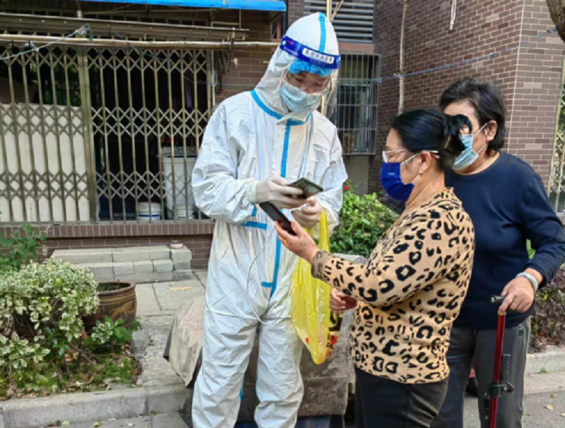 黨員志愿者王禎在鏡湖區(qū)某封控社區(qū)內(nèi)進(jìn)行核酸檢測(cè)登記。