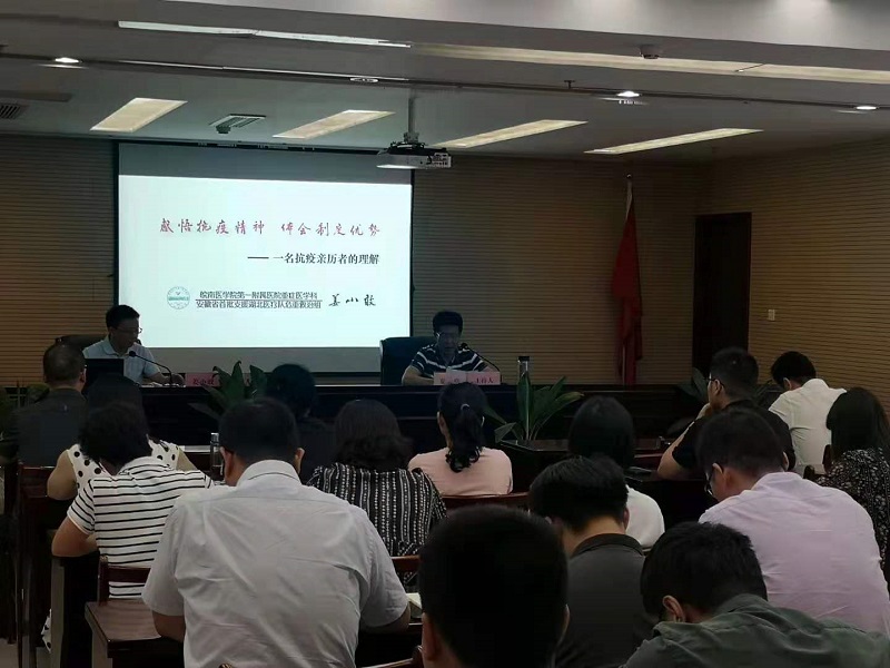 作為安徽首批援鄂醫(yī)療隊(duì)總負(fù)責(zé)人,姜小敢主任曾帶領(lǐng)團(tuán)隊(duì)分別在武漢太康醫(yī)院、協(xié)和東西湖醫(yī)院、肺科醫(yī)院開展了“疫情阻擊戰(zhàn)”、“疫情圍剿戰(zhàn)”和“疫情殲滅戰(zhàn)”。姜主任從抗疫經(jīng)歷回顧、感悟抗疫精神、體會(huì)制度優(yōu)勢等三方面回顧和分享了他馳援武漢抗擊疫情的經(jīng)歷和體會(huì)。一幅幅身臨一線的圖片、一段段飽含深情的話語,生動(dòng)再現(xiàn)了疫情發(fā)生后,全國各地醫(yī)護(hù)人員、防疫人員、共產(chǎn)黨員及社會(huì)各界不怕危險(xiǎn)、不怕犧牲,筑起防御病毒的堅(jiān)強(qiáng)堡壘的感人事跡。那一段段用生命守望生命的故事讓現(xiàn)場的每位聆聽者心靈都受到強(qiáng)烈震撼和感動(dòng)。